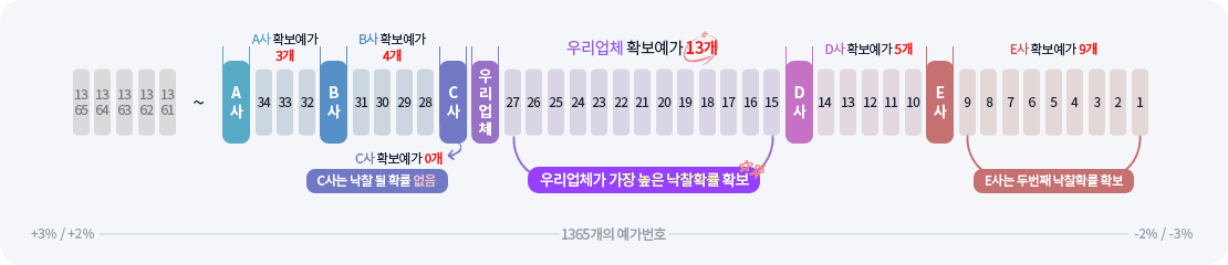 확보예가의 정의 확보예가란 낙찰결과에서 발표된 1365개의 예가 중 입찰에 참여한 업체가 확보한 예가의 개수를 의미합니다.